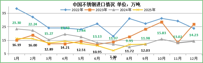 一、2025年1-9月国内不锈钢进口情况2025年9月,国内不锈钢进口量约12.03万吨,环比增加0.32万吨,增幅2.7%[详细]