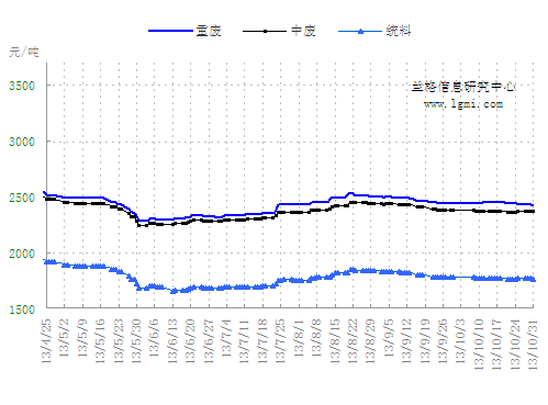 10月份国内废钢市场弱势不改,市场报价变动幅度不大,资源交易量基本没有提升。国内废钢市场价格已经处于较低水平,可钢厂在亏损中,为了成本考虑,对废钢的采购青睐度仍然不高,采购价格以下调为主,量少价低已是多数钢厂政策主旨,其中不乏停采观望的。商家操作积极性放缓,资源进出频率跟前期差不多,库存依旧维持在低位,厂商对后期市场预期值不高,心态较为平淡。“金九银十”的旺季成为泡沫,进入11月份,“十八大三中全会”即将召开,或许会有利好政策出台,但四季度随着天气转冷,开工面积亦会缩减,利好和利空相博弈,预计11月国内废钢市场将盘整运行。 一、十月份国内废钢市场震荡下行 10月份国内废钢市场震荡下行。月前期在钢坯报价上扬的带动下,部分地区废钢市报价也随着上行;后期期货电子盘运行不佳,成品材运行亦趋弱,在此情形下,国内废钢市场出现下滑行情。废钢市场参与热情度不够高,商家操作依然谨慎小心,以快进快出为主。据兰格钢铁信息研究中心市场监测显示:截至10月31日,国内重废市场均价为2422元(吨价,下同),较月初跌18元。国内中废市场均价为2367元,较月初跌15元。国内统料市场均价为1767元,较月初跌13元(详见图1)。