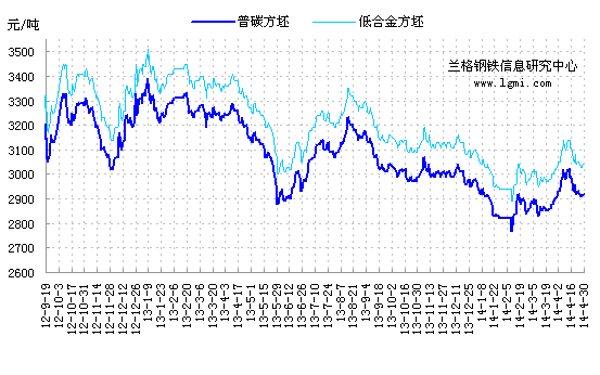 对于钢市来说,4月属于传统的需求旺季;同时钢坯库存的不断下降,也让拉涨气氛更加浓郁;再加上降准预期较强,故月初唐山地区主导钢厂开始上拉钢坯报价,随后国内其他市场钢坯价格出现跟涨。但好景不长,一季度经济数据让市场预期发生了变化,GDP7.4%的增速虽处于偏低水平,但也在政府可承受范围内,因此降准预期渺茫,期货市场首先开始回落,随后钢材现货价格也随之走低,钢坯也不例外。据兰格钢铁信息研究中心市场监测显示:截至4月30日,唐山地区普碳方坯出厂价格2920元,较上月末涨10元(详见图1)。