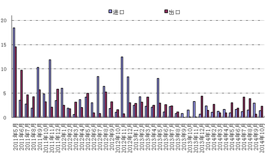 据国家海关统计数据显示:2014年10月生铁进口量为1.4万吨,环比减少1.55吨,增幅52.54%。10月生铁出口量为2.3万吨,环比增加1.64万吨,增幅248.48%(详见图1)。