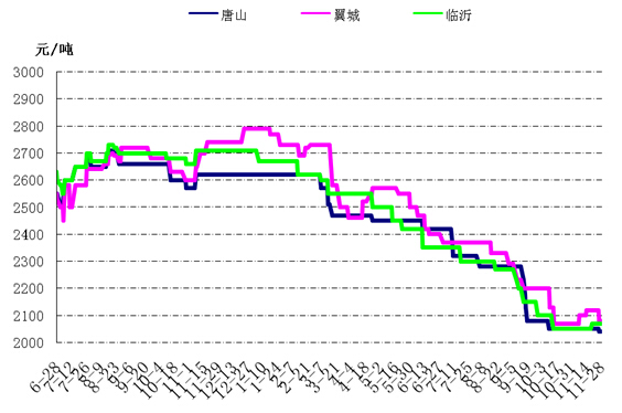 截至11月30日,天津地区报价2120元(吨价,下同),较月初下跌30元;唐山地区报价2040元,较月初下跌10元;翼城地区报价2080元,较月初持平;临沂地区报价2070元,较月初上涨20元(详见图3)。