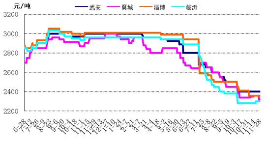 截至11月30日,天津地区报价2820元,较月初持平;武安地区报价2400元,较月初持平;翼城地区报价2320元,较月初下跌20元;上海地区报价2580元,较月初持平元;临沂地区报价2300元,较月初上涨20元(详见图4)。