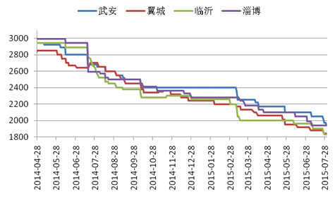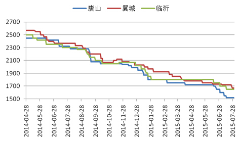 截至7月31日,天津地区报价1510元(吨价,下同),较月初下跌140元;唐山地区报价1520元,较月初下跌80元;翼城地区报价1670元,较月初跌60元;临沂地区报价1650元,较月初下跌50元(详见图3)。