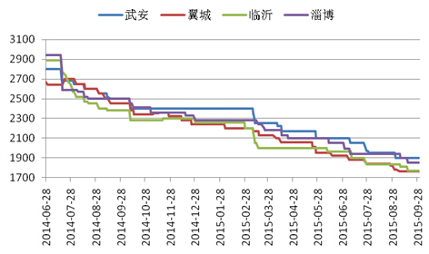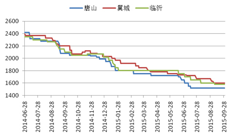 截至9月30日,天津地区报价1510元(吨价,下同),较月初持平;唐山地区报价1520元,较月初持平;翼城地区报价1600元,较月初下跌30元;临沂地区报价1580元,较月初下跌20元(详见图3)。