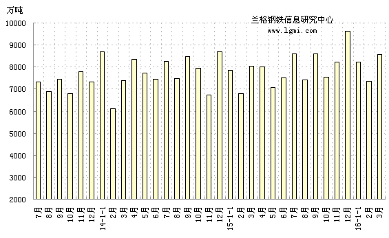 据海关总署公布统计数据显示,2016年3月份我国进口铁矿石量为8577.17万吨,环比增加1216.01万吨,增幅为16.52%,同比增加526.27万吨,增幅为6.5%。