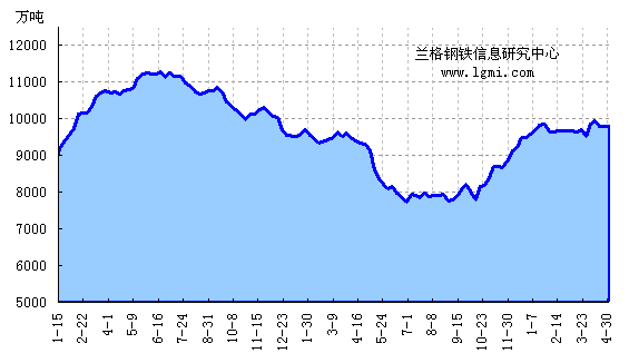 随着进口矿价格的不断上涨,铁矿石港口库存量增加明显,据兰格钢铁云商平台监测数据显示,国内主要港口铁矿石库存量从年初的9500万吨,最高时增长到近1亿吨的库存量,4月份港口库存量维持在9800万吨上下波动,处于较高位置(详见图2)。