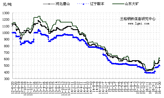 4月份国产矿市场上涨明显,尤其华北地区市场涨势凸显。受进口矿价格上涨拉动,及成材价格走高影响,唐山地区国产矿价格上涨明显,且成交状况颇佳,由于进口矿价格阶段涨幅颇大,使得国产矿价格的性价比明显提升,加之唐山世园会的开幕,部分烧结机限产,抑制了钢铁企业对进口矿的采购需求,而加大球团及块矿的用量,为此对国产矿的需求明显增加,促使唐山、武安等地铁矿石价格明显上涨。东北地区市场有所上调,上涨区域主要集中在辽东地区,鞍山、辽阳、丹东等地区市场均有所上调,随着铁矿石价格的走高,东北地区矿山企业开工量略有增加,加之进口矿现货价格偏高,使得国产矿市场具有一定操作空间。华东地区市场涨幅较大,受进口矿价格大幅上调影响,山东等地大型矿山企业上调铁矿石出厂价格热情颇高,当地钢铁企业均接受矿山调幅,促使国产矿价格涨至年内高点。