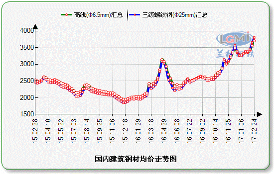 上海市场:2月28日,Φ6.5mm高线、Φ18-25mm三级螺纹钢价格分别为3950元和3770元,比上月末上涨380元和540元。