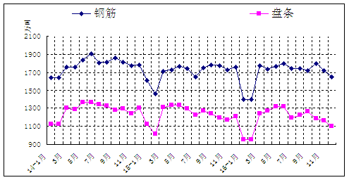 据国家统计局数据显示,2016年12月份我国钢筋和线材产量分别为1647.8万吨和1100.8万吨,同比分别下降6.1%和9.06%,环比下降4.36%和5.096%(详见图2)。