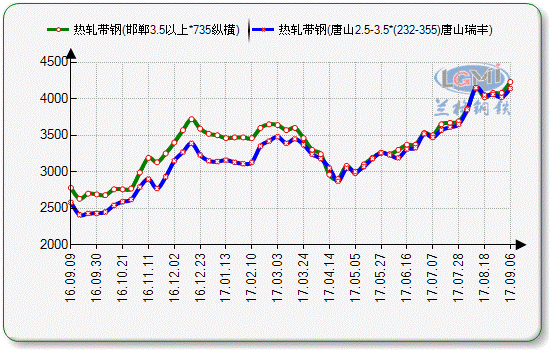 据兰格钢铁信息研究中心市场监测显示:截至8月31日,唐山地区,瑞丰产2.5-3.5×(232-355)带钢价格为3980元,比上月末累涨210元;邯郸市场,纵横产3.5以上×735带钢价格为4050元,比上月末累涨250元(见图2)。