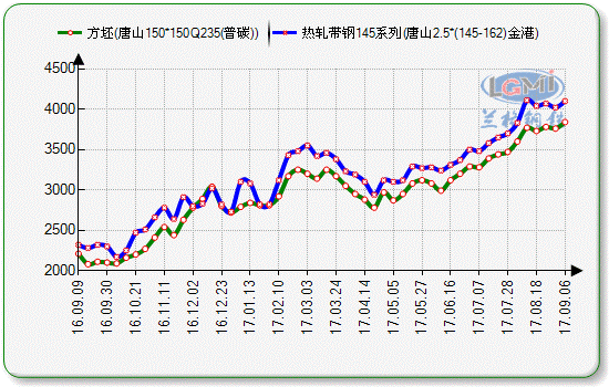 据兰格钢铁信息研究中心市场监测显示:截至2017年8月31日,唐山地区2.5×145带钢主流含税出厂价格为3980元,比上月末累涨200元;唐山地区普碳方坯出厂含税价格为3710元,比上月末累涨160元(见图1)。