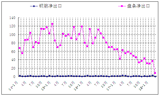 图3 钢筋、盘条每月净出口量走势图