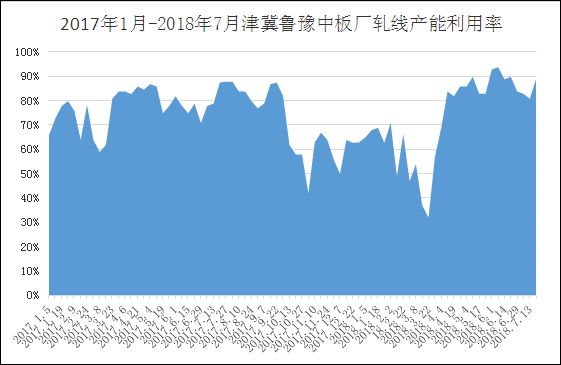 图2 2017年1月-2018年7月津冀鲁豫中厚板厂轧线产能利用率