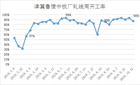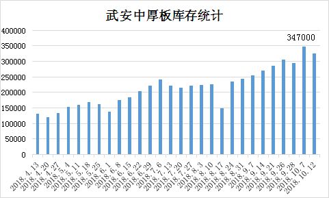 12国内中厚板市场价格稳中有降。截至10月12日,国内重点城市16-25mm普板均价4333元(吨价,下同),较上周同期跌7元,较上月同期跌136元。今日黑色系期货震荡开盘,中板市场价格以稳为主,不过部分地区在昨日出货欠佳的情况下,现货价格小幅下跳10—20元。钢坯方面无亮眼表现,现唐山普碳方坯含税出厂价报3890元,暂稳。截至今日,十月第二周已经结束,市场原对 “银十”到来分外期待,对需求释放持乐观态度,但就十月开局本周情况来看,市场并未有明显波动,而在没有大的利好支撑下,市场上涨或受限。从本周频繁发布环保政策上来看,河北省新制定的《钢铁工业大气污染物超低排放标准》和《炼焦化学工业大气污染物超低排放标准》已经省政府批准,将于2019年1月1日实施;《长三角地区2018-2019 年秋冬季大气污染综合治理攻坚行动方案》(征求意见稿)发布;唐山市政府决定自10月11日18时至18日24时期间,执行秋冬季错峰生产措施, 等等一系列的环保措施,再加上宽松的经济政策,央行频繁放准,在这些利好支撑下,近期钢材市场价格也没有涨起来,可见,虽然市场需求存有,国家鼓励基建,但需求释放较为一般,供需关系一直是处于不断的自我调整中,同时在季节的影响下,北方天气日渐转冷,市场需求或进一步萎缩,对价格支撑不利。库存方面来看,节假日以后,多数地区库存增加,商家出货略有压力。据兰格网统计武安库存:截至发稿时,武安库存万吨,较上周万吨。钢厂开工率方面:目前津冀鲁豫中板厂日均中板产万吨产能利用率88%,周比降6个百分点。钢厂价格方面,个别厂家跟随市场略有下调,部分维稳,今日钢厂接单情况大大增加,对市场价格有一定支撑。综合而言,在外围政治风险仍存以及国内环保经济政策影响的情况下,预计短期内国内中厚板市场价格或继续弱势盘整。