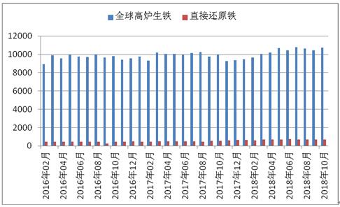 根据国际钢铁协会公布的最新统计数据显示,2018年10月份全球高炉生铁总产量较2018年9月份相比有所增加,2018年10月份直接还原铁总产量较2018年9月份相比有所增加;全球高炉生铁日均产量小幅减少,全球直接还原铁日均产量小幅减少。