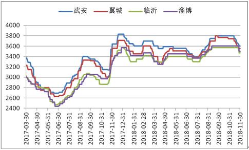 截至11月30日,炼钢生铁天津地区报价2930元(吨价,下同),较月初跌400元;唐山地区报价2920元,较月初跌430元;翼城地区报价3100元,较月初跌200元;临沂地区报价2950元,较月初跌330元(详见图3)。