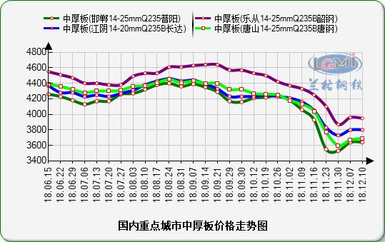 据兰格云商平台监测数据显示,截至12月10日,国内重点城市16-25mm普板主流价格保持在3791元(吨价,下同),均价较上个交易日下跌6元,较上周同期下跌65元,较上月同期下跌418元。本月第一周国内中板市场在月初“习特”会晤,达成共识的余温利好消息影响下,市场持续升温,价格呈现回缓之际。然至周后期,华为CFO孟晚舟被拘,为中美关系再次蒙上不确定因素,且期货震荡走弱,钢坯下调,现货市场交投氛围不活跃,价格承压下调。目前来看,国内主导地区邯郸、江阴、乐从等城市中板(20mm)价格在3640、3800、3950元左右,国内总体中板市场价格稳中有落,而随着利空因素影响,市场或再次走上弱势下跌之路。华北地区钢厂方面:总体锁价政策虽较上周小幅上调,但走势与市场价格基本一致,现普阳锁价基本在3690元左右,较上周五基本持平。武安地区其他钢厂在3670元左右,亦基本持本。唐钢价格基本在3720元左右,较上周五下调30元。其余钢厂基本持平。综合价格方面,本月第一周整体市场先扬后抑,中板价格震荡趋弱,市场情绪面有所转弱,而表面上的贸易战缓和利好影响基本已经消化,因此,根本问题暂时未见明显改善,再者需求减少,钢厂利润收缩,产量下降,且市场成交在需求不佳和商家情绪悲观的影响下甚不理想,故后市而言,国内中厚板市场价格或趋弱运行。