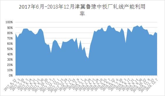 图2 2017年6月-2018年12月津冀鲁豫中厚板厂轧线产能利用率