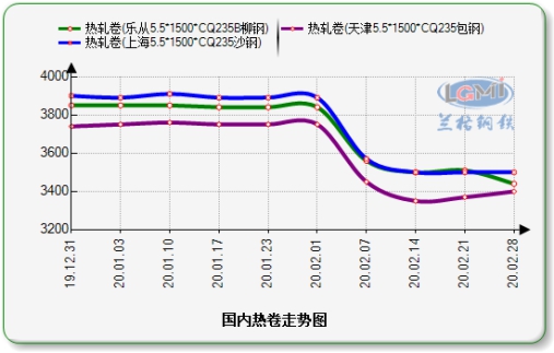 二月初在疫情的影响下,各地市场开工后价格便暴跌百元,临近月末,随着各地运输和需求的复苏,价格呈现触底反弹,但跌幅尚未完全回吐。据兰格钢铁云商平台统计, 截止2月28日,国内热卷4.75-5.75mm均价3476元(吨价,下同),较上月同期跌360。