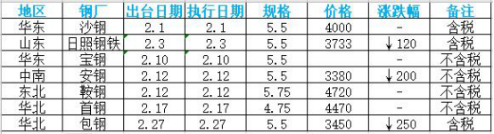 表1 1月钢厂盘价汇总表