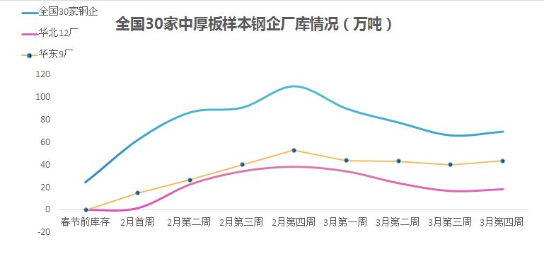 钢厂库存:本周全国30家样本钢企中厚板厂内库存70.05万吨,周增3.35万吨。其中华北12家钢企中板厂库18.7万吨,周增1.6万吨;华东9厂43.55万吨,周增3.55万吨。