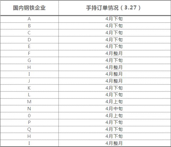 本周调研17家样本企业中厚板的手持订单情况良好,基本仍能维持1个月。一线企业手持订单到4月下旬和月底,个别开始接5月份订单;二线叠加协议也将到4月中旬。