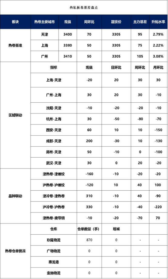 5月7日热卷关联品种价差表现:天津现货:热卷贴水螺纹160元,冷卷升水热卷310元;上海现货:热卷贴水螺纹120元,冷卷升水热卷330元;天津热卷贴水唐山窄带钢10元。