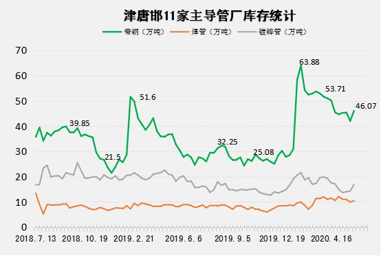 天津唐山邯郸11家主要焊接钢管管厂库存统计:本周(5.28)厂内原料带钢库存46.07万吨,比上月同期增1.42万吨,比去年同期增15.67万吨;焊管库存10.45万吨,比上月同期减1.7万吨,比去年同期增1.6万吨;镀锌管库存16.85万吨,比上月同期增1.92万吨,比去年同期减2.85万吨;日均成交量4.83万吨,比上月同期减0.5万吨,比去年同期减0.14万吨。