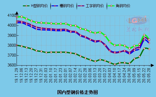 据兰格钢铁云商平台市场监测显示,截至5月29日,国内市场25#工字钢平均价格为3851元(吨价,下同),比上月同期涨120元;25#槽钢平均价格为3824元,比上月同期涨106元;5#角钢均价为3861元,比上月同期涨89元;200×200H型钢价格为3765元,比上月同期涨143元。(详见图1)