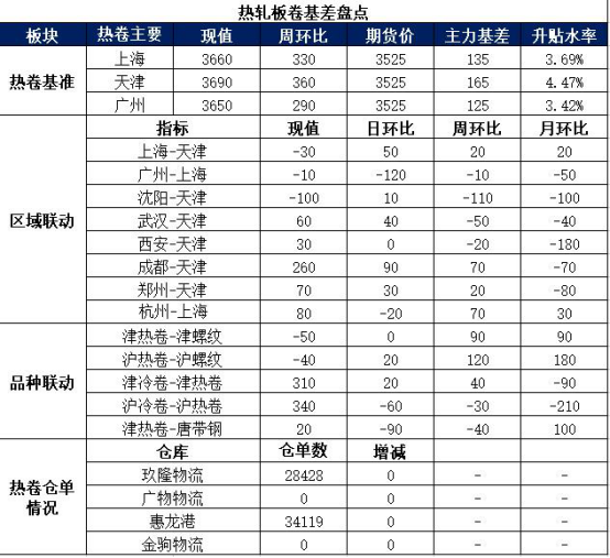 3日热卷区域联动价差:天津5.5mm普卷基价3690:上海价差-30,乐从价差-10