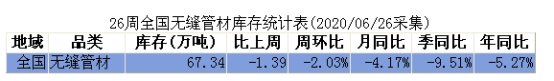 截至6月26日本周无缝管全国23个主导城市社会总库存67.34万吨,同比上周减少1.39万吨,较上周同期下降2.03%,较上月同期下降4.17%,较上个季度同期相比下降9.51%,较去年同期相比下降5.27%。