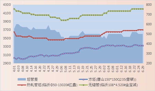 截至6月28日,唐山方坯Q235(普碳)150*150价格3320元,与上个交易日相比持稳,较上周相比下调20元。山东地区20#热轧管坯出厂价格潍钢、江鑫、鲁丽分别为3780元、3700元和3680元。方坯、管坯价差380元,环比上周价差增加40元。