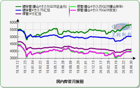 据兰格钢铁云商平台监测数据显示,截至6月30日,全国4寸(3.75)国标焊管平均价格为4138元比上月末上涨80元,全国4寸(3.75)镀锌管平均价格为5039元比上月末上涨115元;唐山地区主导管厂4寸(3.75)焊管出厂挂牌价格为4000元左右比上月同期上调90-110元,唐山地区主导管厂4寸(3.5)镀锌管出厂挂牌价格为5150-5870元比上月同期上调130-150元(见图1)。