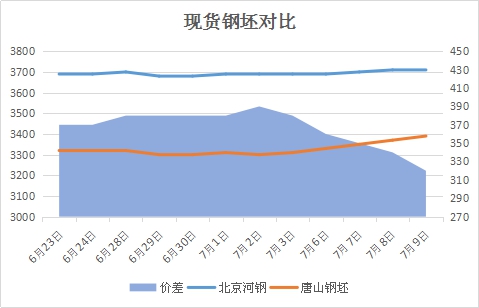 坯螺价差:以北京市场为例,7月9日河钢螺纹基价3710元与钢坯3390元价差320元,较上个交易日缩小20。