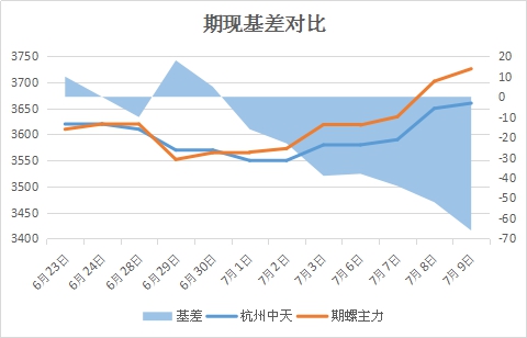期现基差:以杭州市场为例,7月9日中天螺纹基价3660与当日期螺收盘3726基差为-66,较上个交易日缩小14。