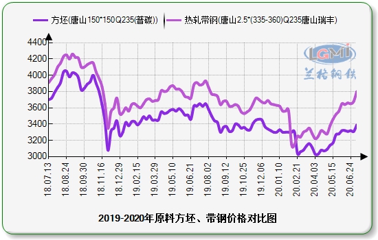 图5 2019-2020年7月原料方坯、带钢价格走势对比
