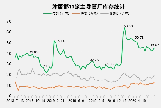 据兰格钢铁云商平台监测数据显示:截至2020年7月初天津唐山邯郸11家主流管厂统计厂内原料带钢库存44.7万吨,比去年同期增17.05万吨;焊管库存12.7万吨,比去年同期增4.55万吨;镀锌管库存19.29万吨,比去年同期增3.49万吨;日均成交量4.28万吨,比去年同期降0.36万吨。累库增长率分别为年同比61.66%、55.83%和22.09%,原料、焊管两大库存数据均超去年同期50%以上。
