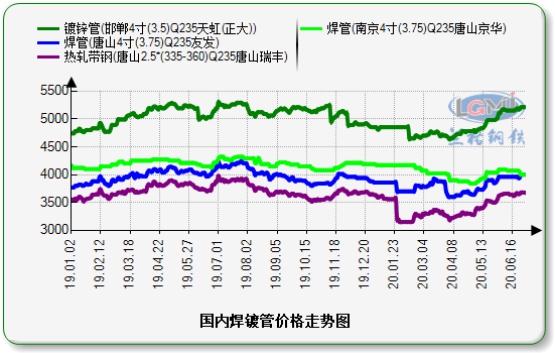 由于公共卫生事件的影响,2020年开春的钢市行情受到了空前的冲击,国家积极推动复工复产,2月底钢铁行业缓慢启动,价格呈现低位运行,至5月阶梯上涨,6月高位横盘。外围环境全球疫情发展关联金融经济环境及各国逆周期调节,供需基本面产量优先于需求启动,补偿试需求过渡,经济复苏进入爬坡阶段,恢复进程趋向缓和。国内焊管市场价格呈现“快涨慢跌”趋势,原料带钢库存持续走低,焊接钢管管厂不饱和生产启动,叠加今年积极推动老旧小区项目改造工程需求释放,供应缺口带动强势支撑,利润下滑引导高产高收。