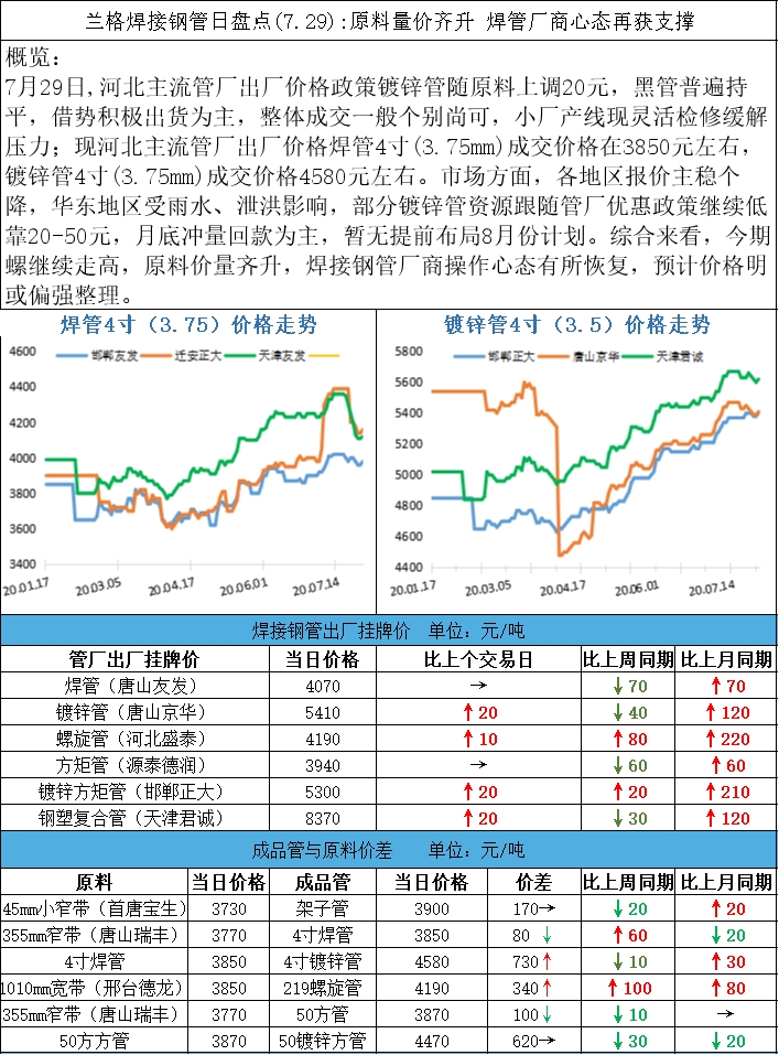 兰格焊接钢管日盘点(7.29):原料量价齐升 焊管厂商心态再获支撑