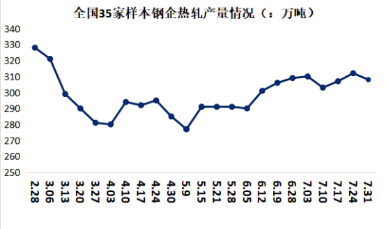 钢厂产量小幅回升:全国35家热卷钢厂产量308万吨,周减4万吨。