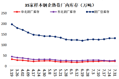 7月31日,兰格云商平台监测的全国热轧卷板钢厂产量较上周小幅减少,钢厂库存小增,钢厂利润基本持平。