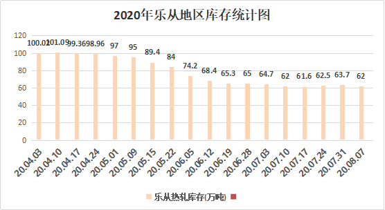 本周乐从热轧库存62万吨,较上周减少1.7万吨。