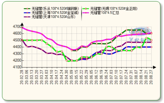 8月27日,国内无缝管整体平稳。据兰格钢铁云商平台监测数据显示:国内重点城市无缝管108*4.5mm均价4612元,与上个交易日持平。今日管坯价格坚挺,管厂价格暂时持稳,但临近月底出于库存压力,部分管厂实施优惠政策刺激拿货,所以管厂库存近期将会有明显下降。市场整体成交一般,临近月底各地无缝管贸易商操作多以稳价出货,回款周转为主,调价意愿不高,故整体持稳报价。据杭州地区无缝管贸易商反馈,目前日均出货量在200-300吨左右,心态略显悲观,认为传统“金九银十”很难形成市场需求高潮,市场价格再度拉涨可能性较低。综合来看,预计国内无缝管市场近期将弱稳运行。