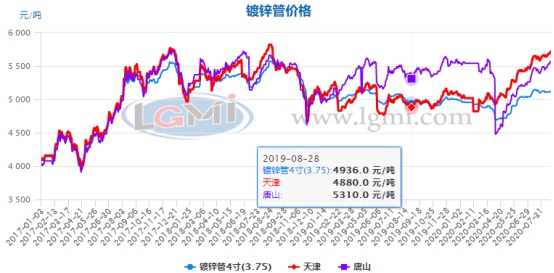 河北10家主导镀锌管厂出厂挂牌价4寸(3.5mm)过磅含税4670元-5750元,月环比涨跌40-60元;