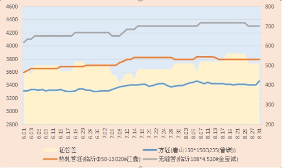 截至8月31日,唐山方坯Q235(普碳)150*150价格3460元,与上个交易日相比上调60元。山东地区20#热轧管坯出厂价格潍钢、江鑫、鲁丽分别为3900元、3790元和3810元。其中江鑫管坯整体合同饱和度有所下降。今日管坯价格暂稳,以临沂地区江鑫和金宝城相比,管厂、管坯价差510元,环比上周价差缩减10元。近两周管坯价格较为稳定,上下浮动较小。管厂也迎来了短暂的平稳期,多以观察市场为主。