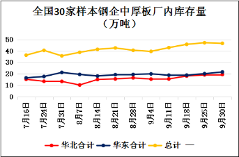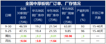 钢厂库存呈下降趋势:本周(9月30日)全国30家样本中厚板钢材生产企业厂内中厚板库存量46.59万吨,比上周(9月25日)减少0.56万吨。其中华北12家钢企中厚板厂库19.2万吨,比上周减少0.2万吨;华东9家钢企中厚板厂库21.54万吨,比上周减少0.01万吨。