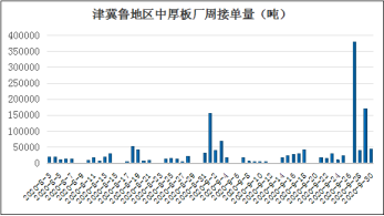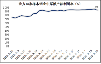 本周津晋冀鲁豫钢厂中厚板产能利用率小降:本周(9月30日)北方13家样本钢企中板日产量8.88万吨,轧线产能利用率93%,周环比降3个百分点,个别钢企日产减量。