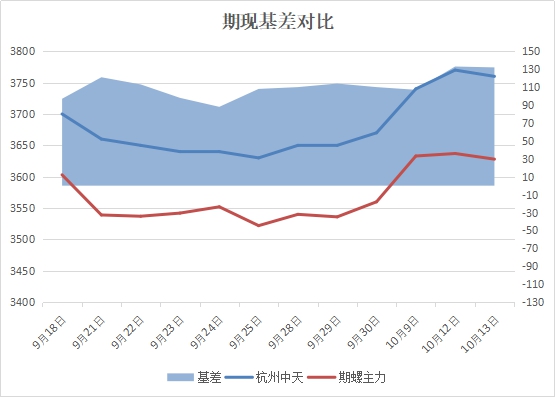 期现基差:以杭州市场为例,10月13日中天螺纹基价3760与当日期螺收盘3628基差为132,较上个交易日扩大1。