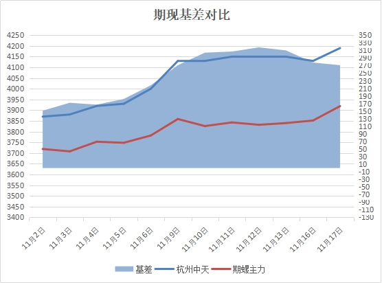 期现基差:以杭州市场为例,11月17日中天螺纹基价4190与当日期螺收盘3919基差为271,较上个交易日缩小7。