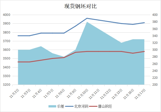 坯螺价差:以北京市场为例,11月17日河钢螺纹基价3910元与钢坯3580元价差330元,较上个交易日持平。